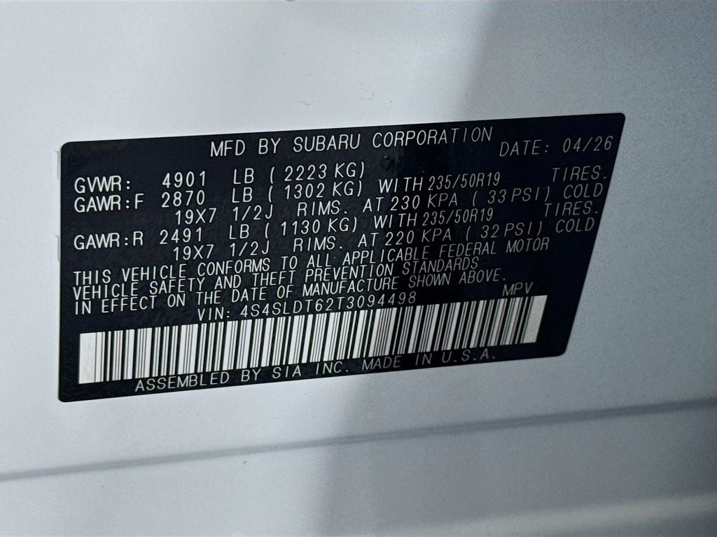 - Wheels: 19" x 7.5 J Dark Gray Aluminum-Alloy -inc: machine finish and black wheel center cap w/Subaru 6 star logo